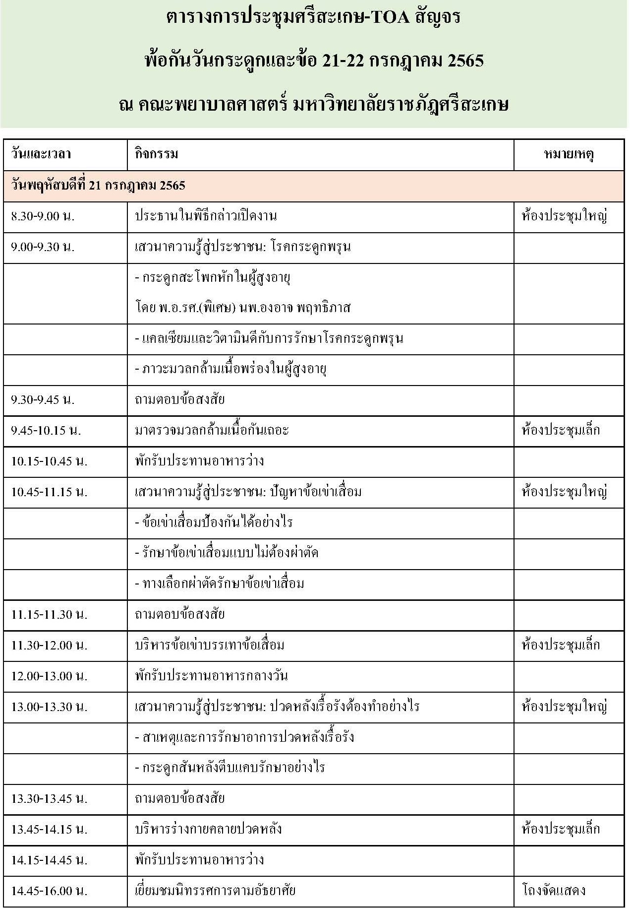 TOA สัญจร พ้อกันวันกระดูกและข้อ 21-22 กรกฎาคม 2565 ณ คณะพยาบาลศาสตร์ มหาวิทยาลัยราชภัฎศรีสะเกษ พิมพ์ ดาวน์โหลดไฟล์ 1 VDO